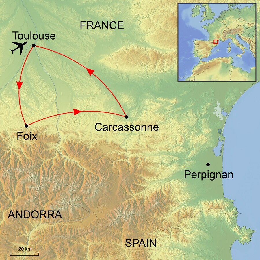Airport transfers between Toulouse and our hotels in Foix and Carcassonne will be by road taking around 1hr 30mins. Our transfer between centres does not take long but we take time in the day to stop in Mirepoix before completing our journey.
