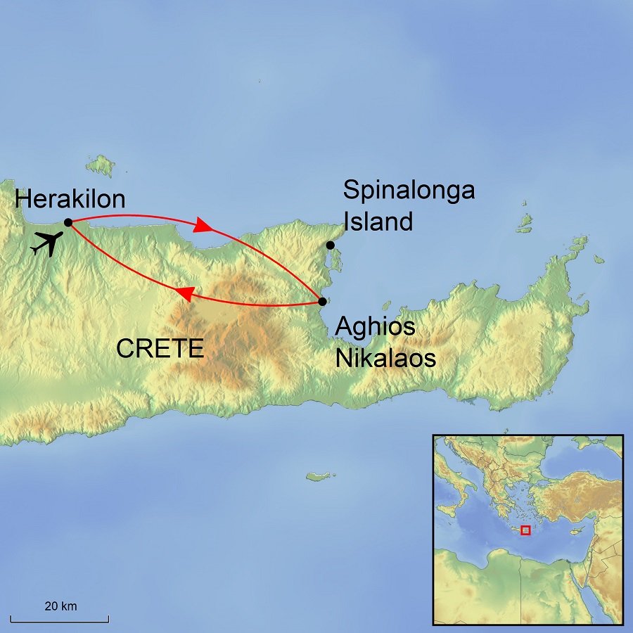 You'll explore small villages, with their shady squares and traditional tavernas, have the option to visit the Venetian island fortress of Spinalonga on a walk and on a free day you may wish to take the bus or taxi to the city of Heraklion with its archaeological museum. A short bus ride from Heraklion is the archaeological site of the ancient Minoan city of Knossos.