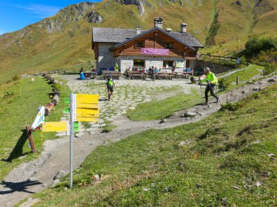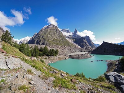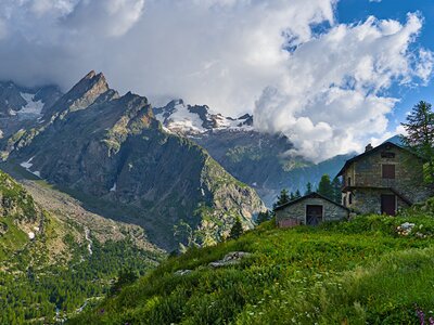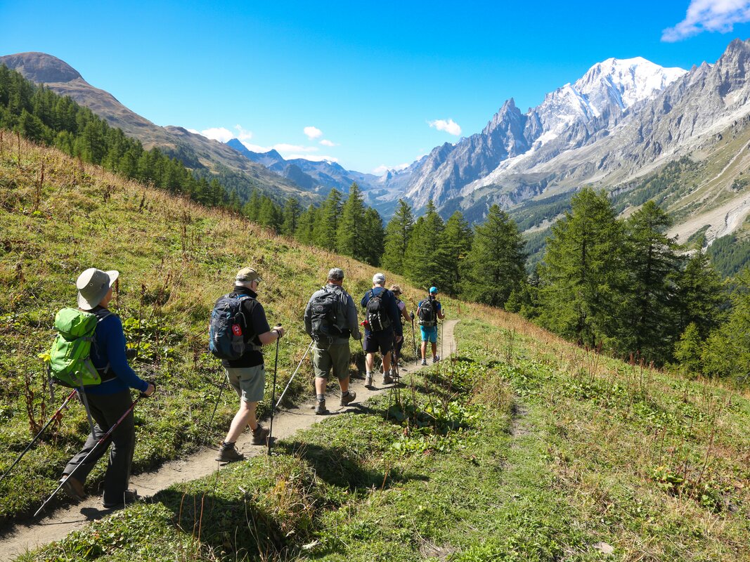 Your first day begins in the open pastures of Lavachey, where the trail rises gently through meadows brushed by the morning sun. As you climb toward Rifugio Bonatti, the jagged skyline of the Grandes Jorasses emerges, and the full sweep of the Italian Val Ferret opens at your feet. Bonatti’s terrace is a natural balcony, perfectly positioned to showcase the Mont Blanc massif in all its grandeur. From here, glaciers spill down the mountainsides in dramatic, frozen cascades, their blue crevasses catching the light as you walk.