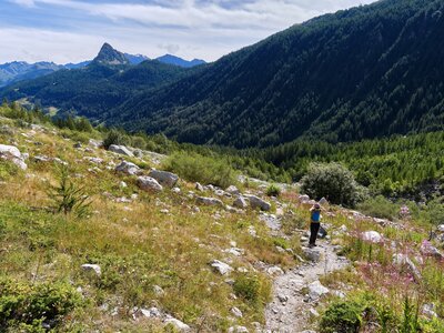 The next day offers a different rhythm. You wander through Dolonne and climb steadily toward Plan Chécrouit, where the views widen with every step. At the Col Chécrouit, the vast Miage Glacier dominates the skyline, a massive river of ice flowing down the valley. After a pause at Maison Vieille, you traverse the wide, sunlit pastures of Arp Vieille, then descend toward the turquoise waters of Lac Combal, set in a broad glacial basin. The final stretch through the quiet lower valley leads you to La Visaille, completing a day rich in contrasts—high ridges, open meadows, and deep glacial landscapes.