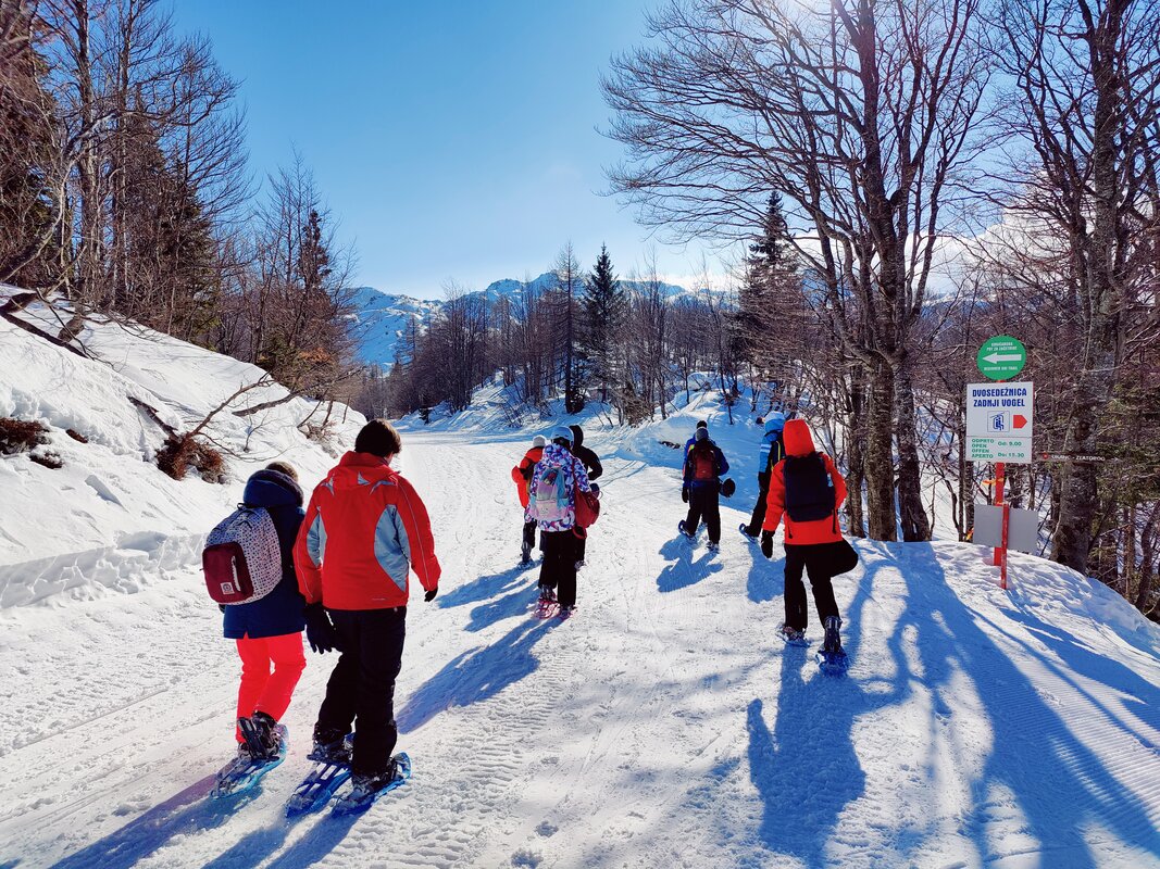 You travel by transfer from Hotel Bohinj to Soriška Planina, where your snowshoe walk begins in a peaceful, high‑level alpine setting. Starting out, you head across quiet winter terrain, following a route that rises and falls gently through open landscapes and forested sections.