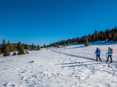 You travel by transfer from Hotel Bohinj to Soriška Planina, where your snowshoe walk begins in a peaceful, high‑level alpine setting. Starting out, you head across quiet winter terrain, following a route that rises and falls gently through open landscapes and forested sections.