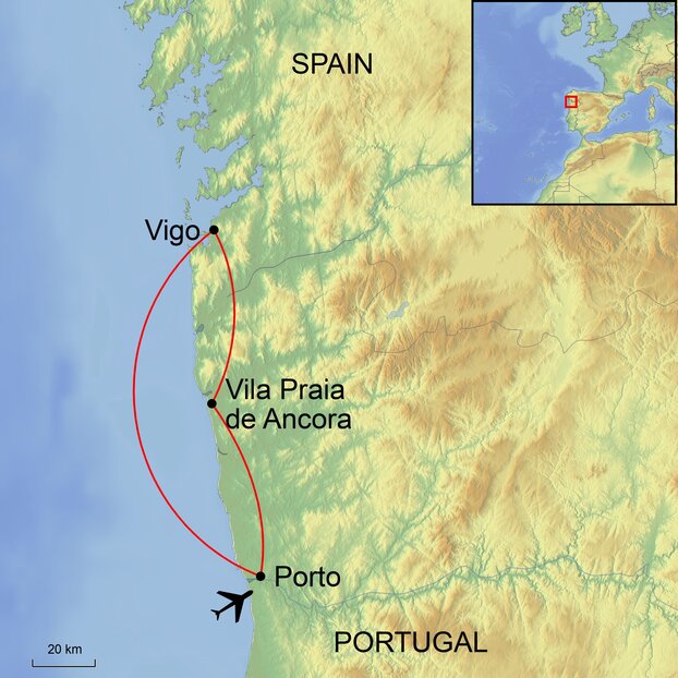 We fly between London to Porto. We include a private transfer to Vigo which will take approximately 1 hour 40 minutes. Our return transfer from Praia de Ancora to Porto is 50 minutes.