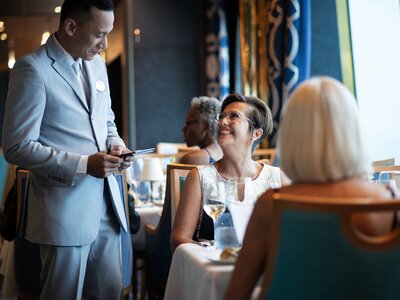 Come evening, prepare for a sumptuous five-course á la carte menu in a stylish restaurant. The menu, crafted by award-winning chefs, boasts a variety of mouth-watering options, with accommodation for special diets like fat-free, vegetarian, and gluten-free meals. Served by courteous waiting staff, the dinner experience creates a wonderful atmosphere. Our reservation for dinner at 6pm ensures you have ample time to enjoy the evening entertainment if desired. Wine options can be pre-ordered through the Maître'd, the interactive intranet in your cabin or directly at the table.